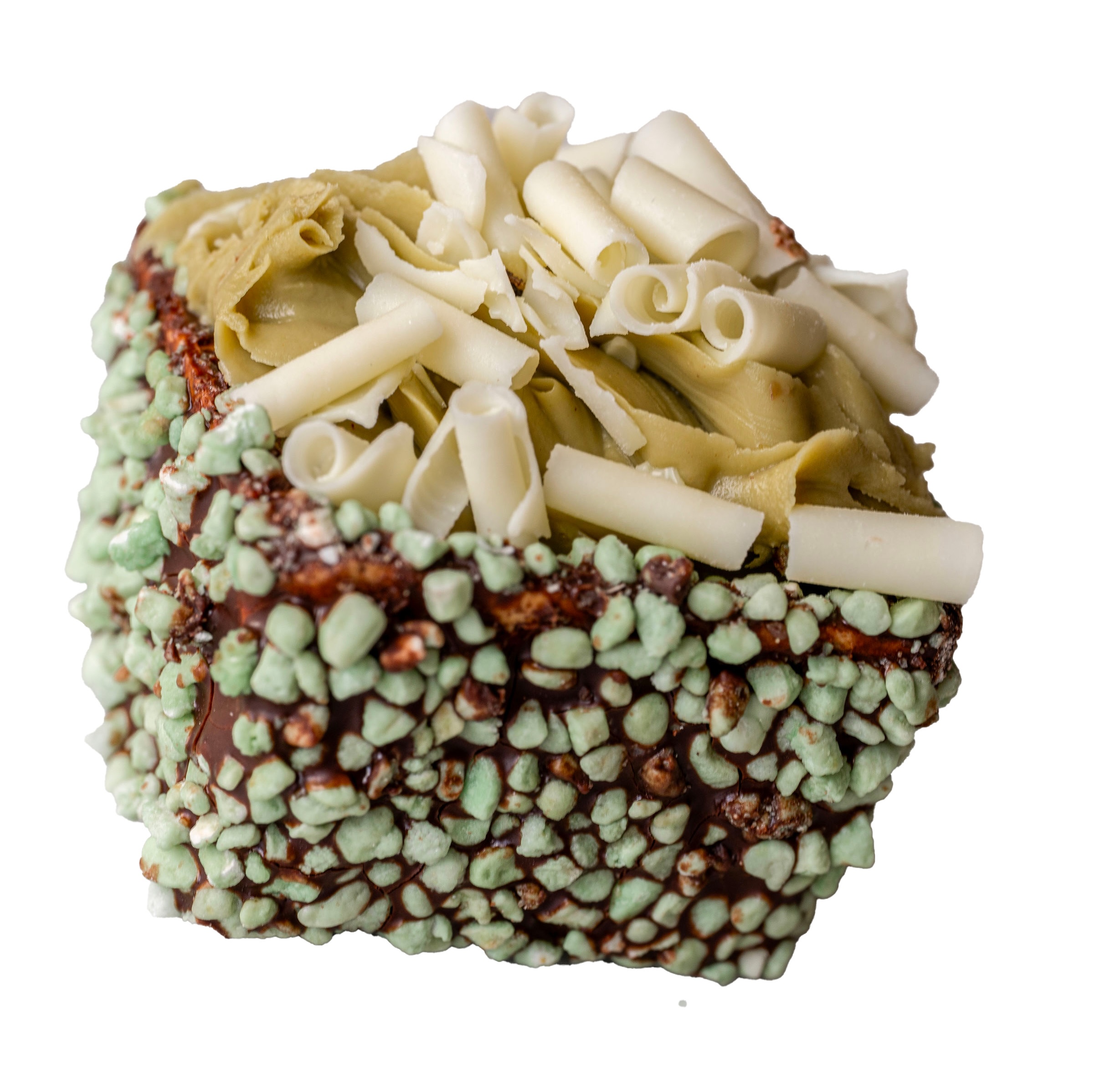 A decadent chocolate-coated square shortcrust layered with rich Sicilian pistachio cream, topped with elegant swirls of white chocolate. A luxurious treat with the vibrant, nutty essence of Sicily in every bite.